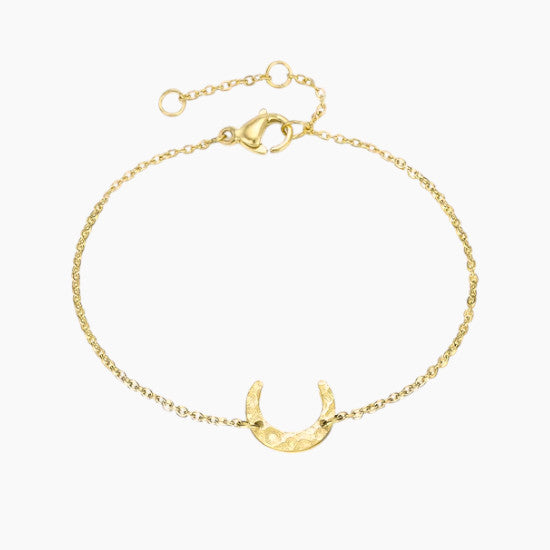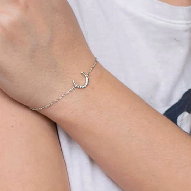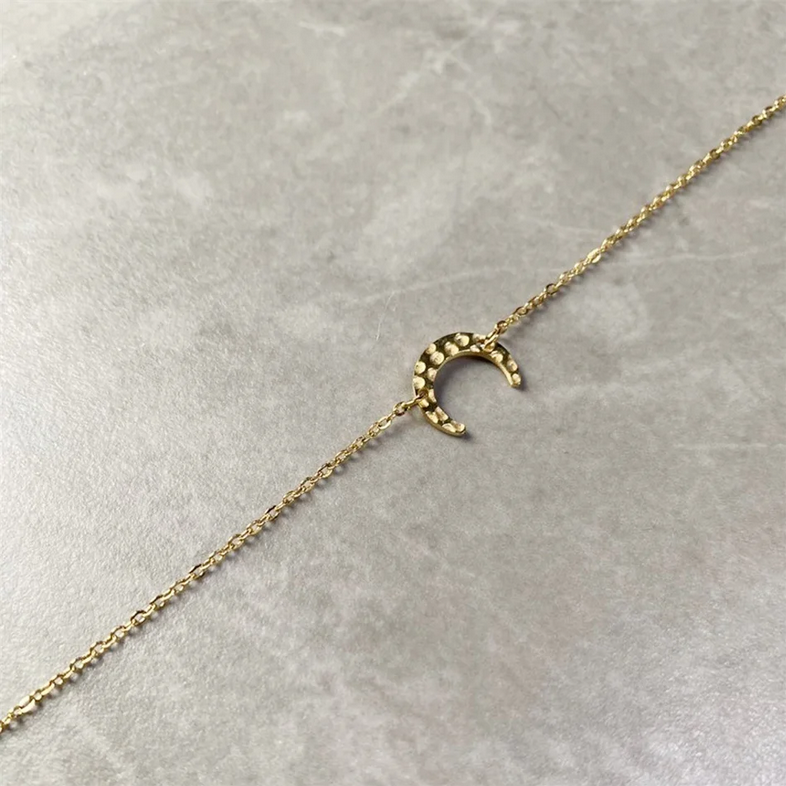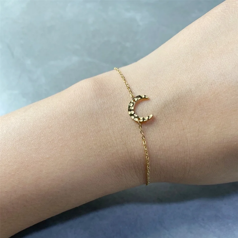 Минималистична гривна с изящна висулка във формата на сърповидна луна. Релефната ѝ повърхност улавя светлината по красив начин, напомняйки за нощното небе и неговата мистична енергия. Подходяща за ежедневието или като нежен акцент към вечерна визия.