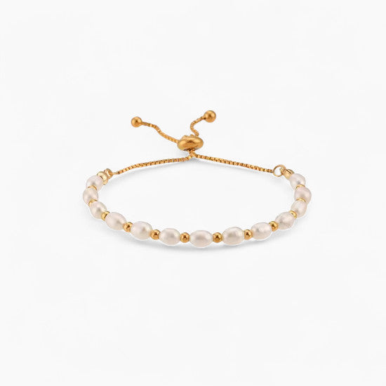 Стилна регулируема гривна с естествени сладководни перли и златисти мъниста. Перфектният аксесоар за ежедневна употреба и специални поводи, който съчетава лукс и комфорт. Широката и устойчива верижка осигурява здравина, а естествените перли придават изтънчен блясък. Заради естествения си произход перлите може да се различават по размер и форма, което прави всяка гривна уникална.