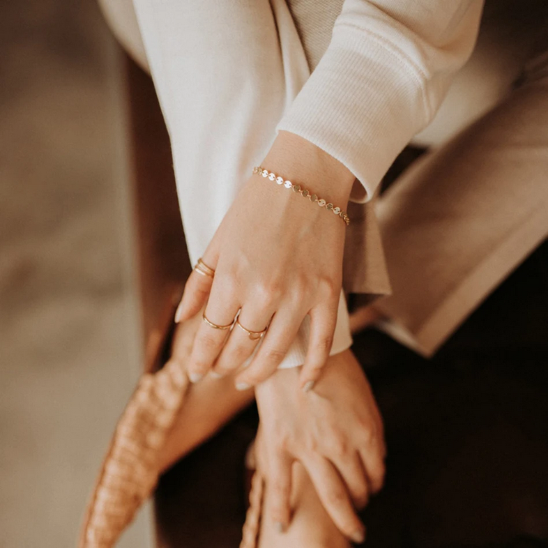 Нежна и минималистична гривна, изработена от вплетени кръгли елементи, наподобяващи малки монетки. Свързани помежду си в деликатна верижка, те символизират връзката между хората – фина, но здрава. Подходяща за ежедневието или като символичен подарък за приятелство.