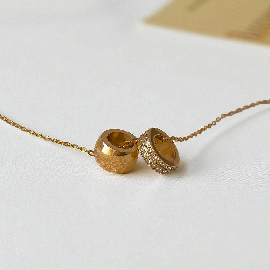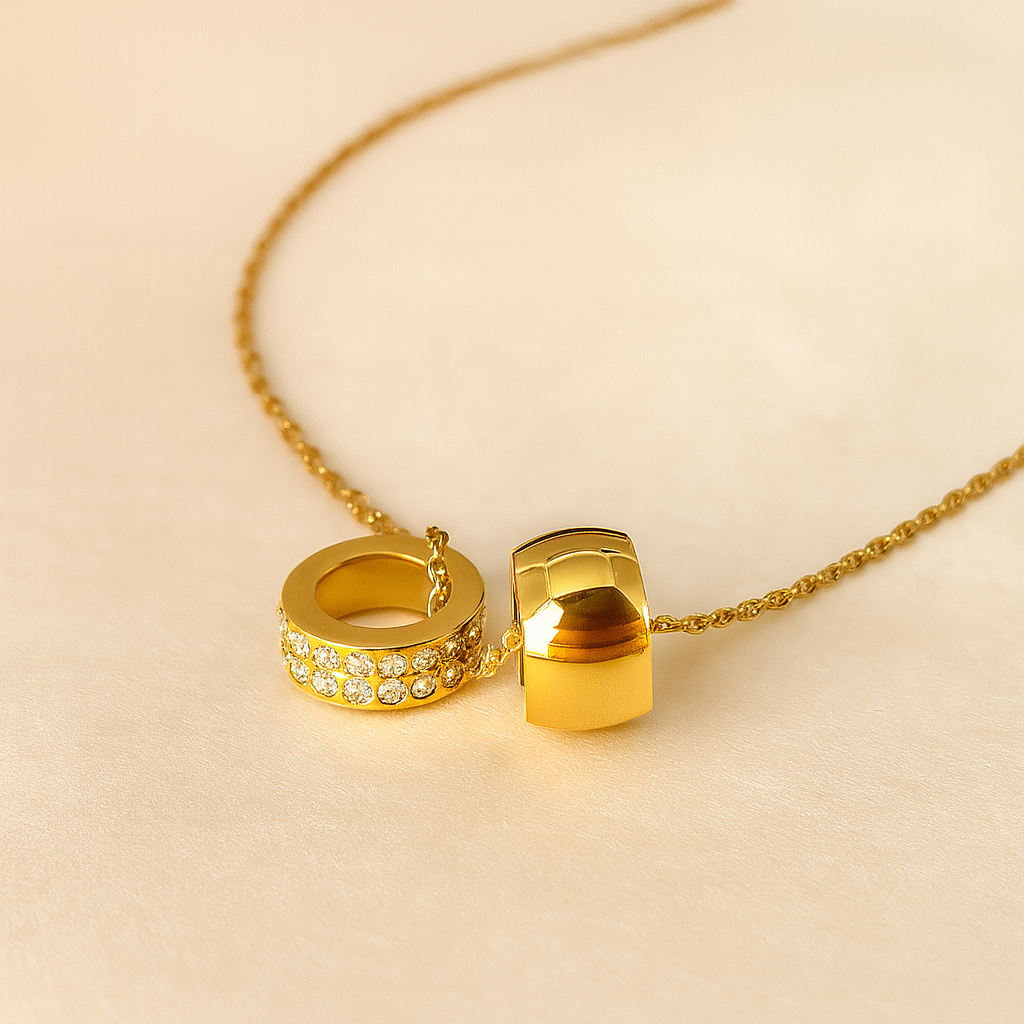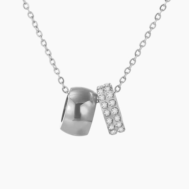 Фино колие с две елегантни халки – едната със сияйни циркони, другата със стилен изчистен дизайн. Символ на баланс и връзка, които се допълват в съвършена хармония. Носи го като израз на любов, единство или като модерен акцент за всяка визия.