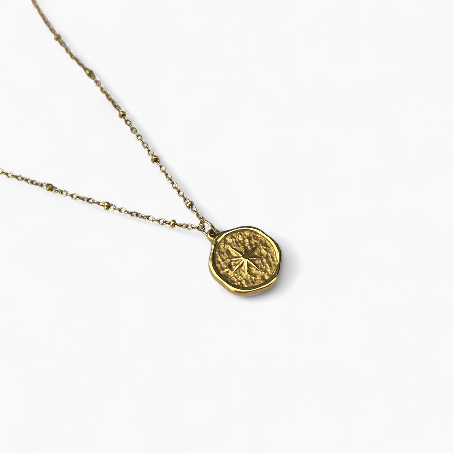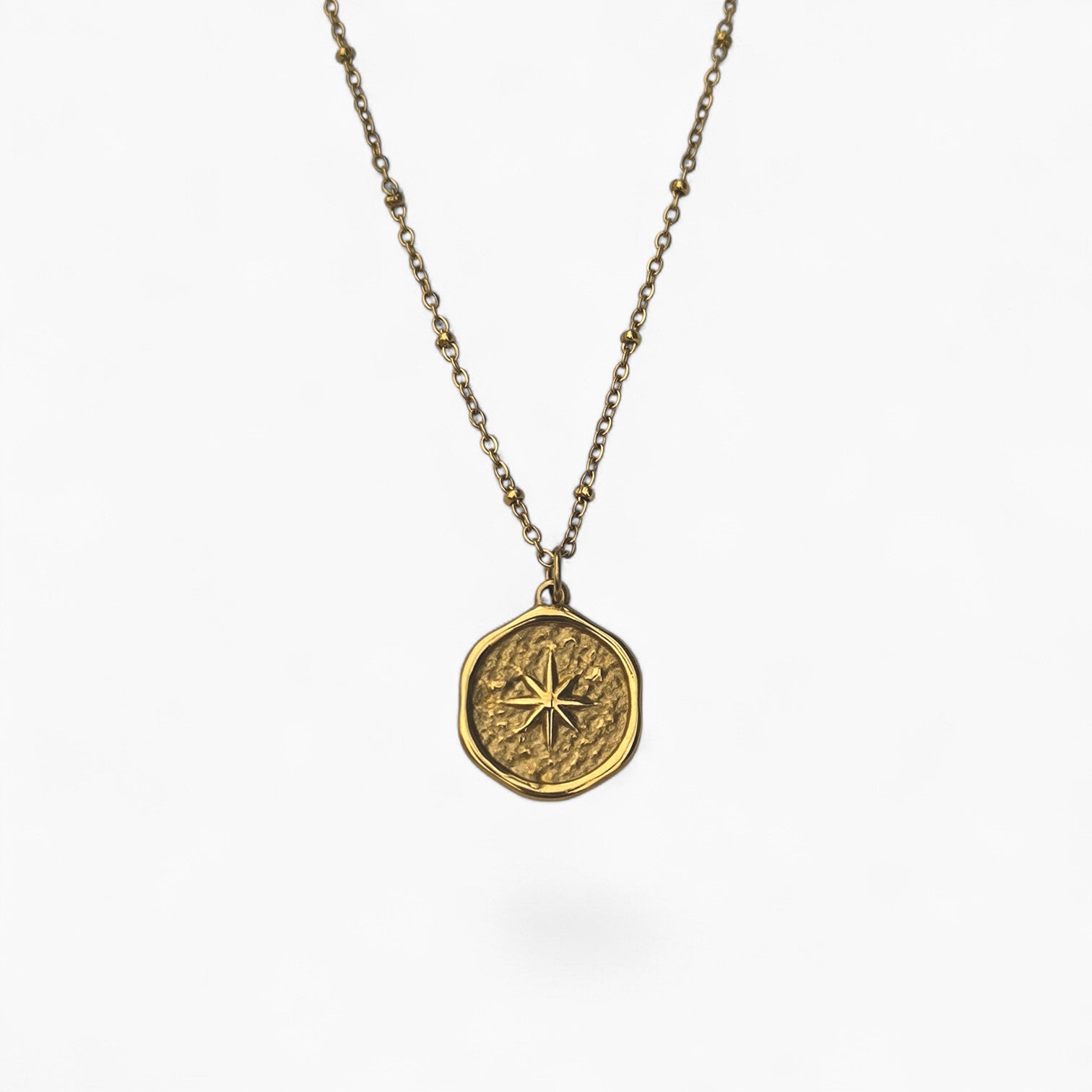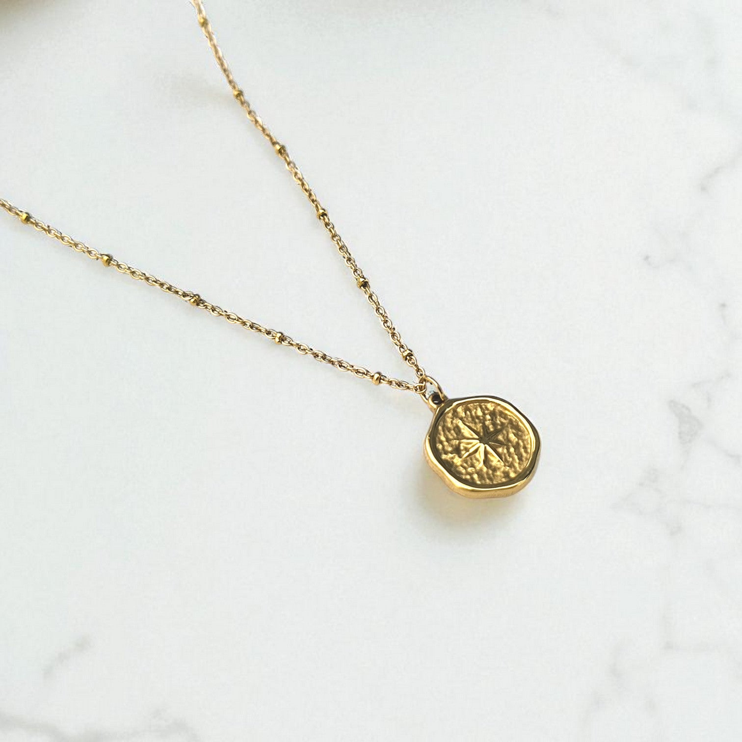 Колие със символична визия и смисъл – кръгла висулка със „щастлива звезда“ в центъра, която напомня, че светлината винаги е около нас. Носи послание за късмет, ново начало и лична сила. Подходящо за всеки ден или като талисман за специален повод.
