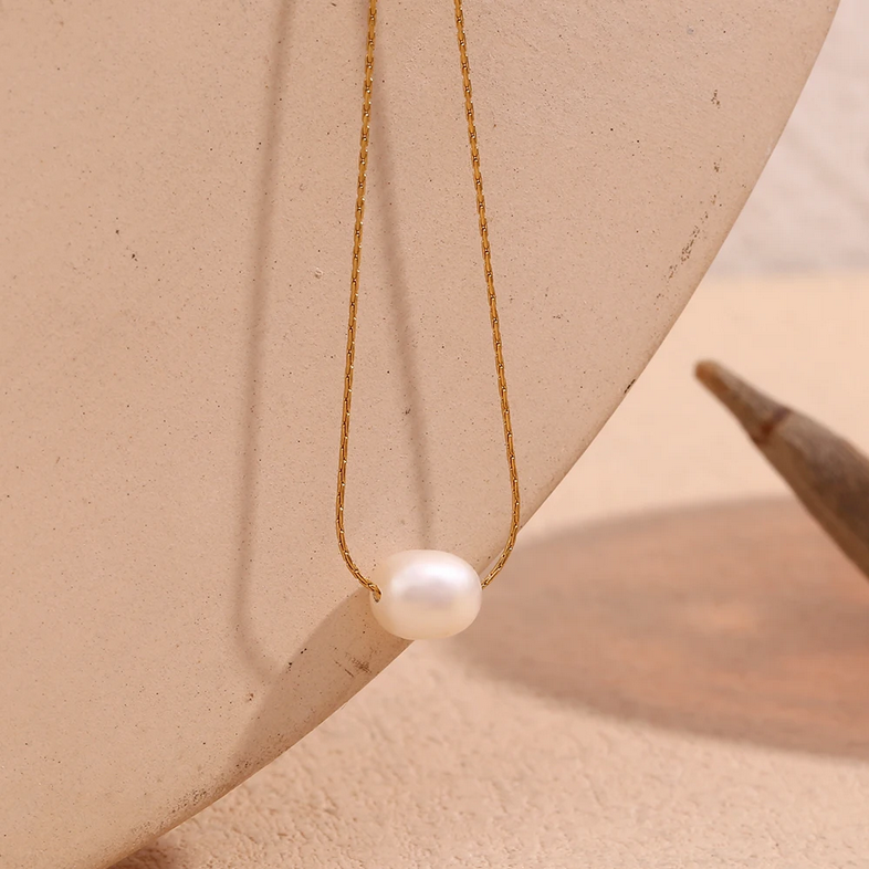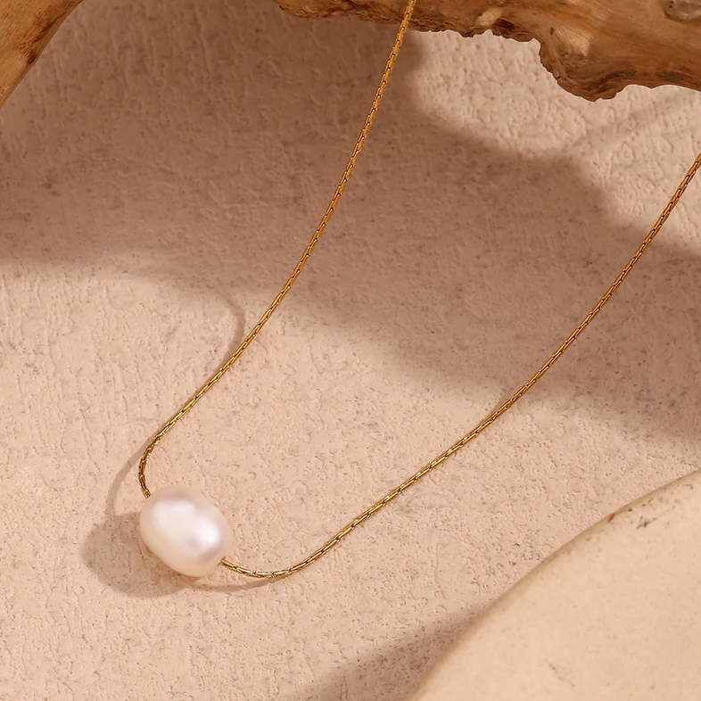 Елегантно и изчистено колие с естествена сладководна перла. Фината верижка е идеална за ежедневна употреба и допълва перлата по изтънчен начин. Перлите са естествени, затова размерът и формата им могат да варират, което прави всяко колие уникално.