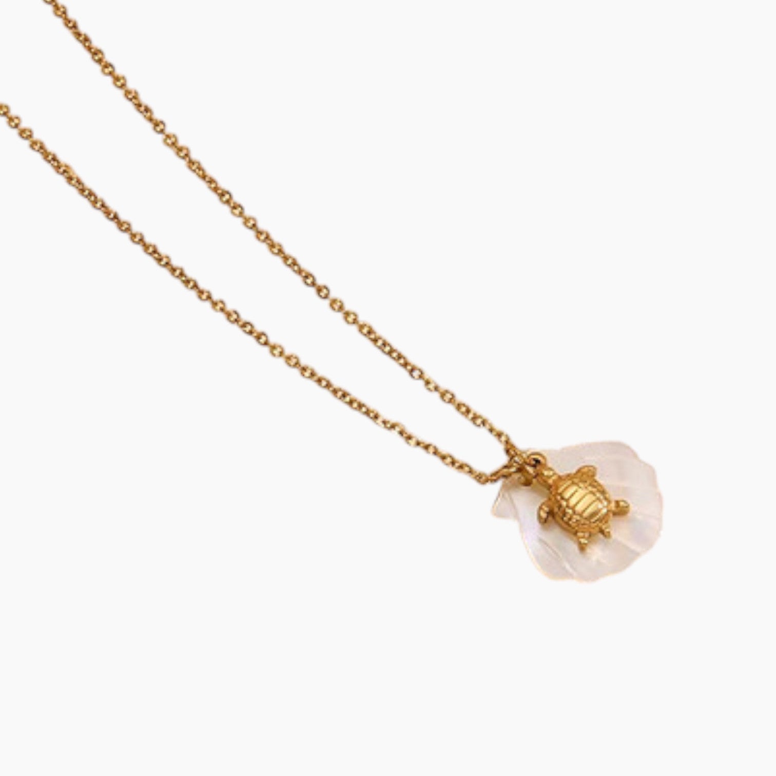 Нежно колие с морски мотиви – стилна комбинация от морска костенурка и мида.. Символ на дълголетие, спокойствие и лятна енергия – съвършено допълнение към всяка визия.