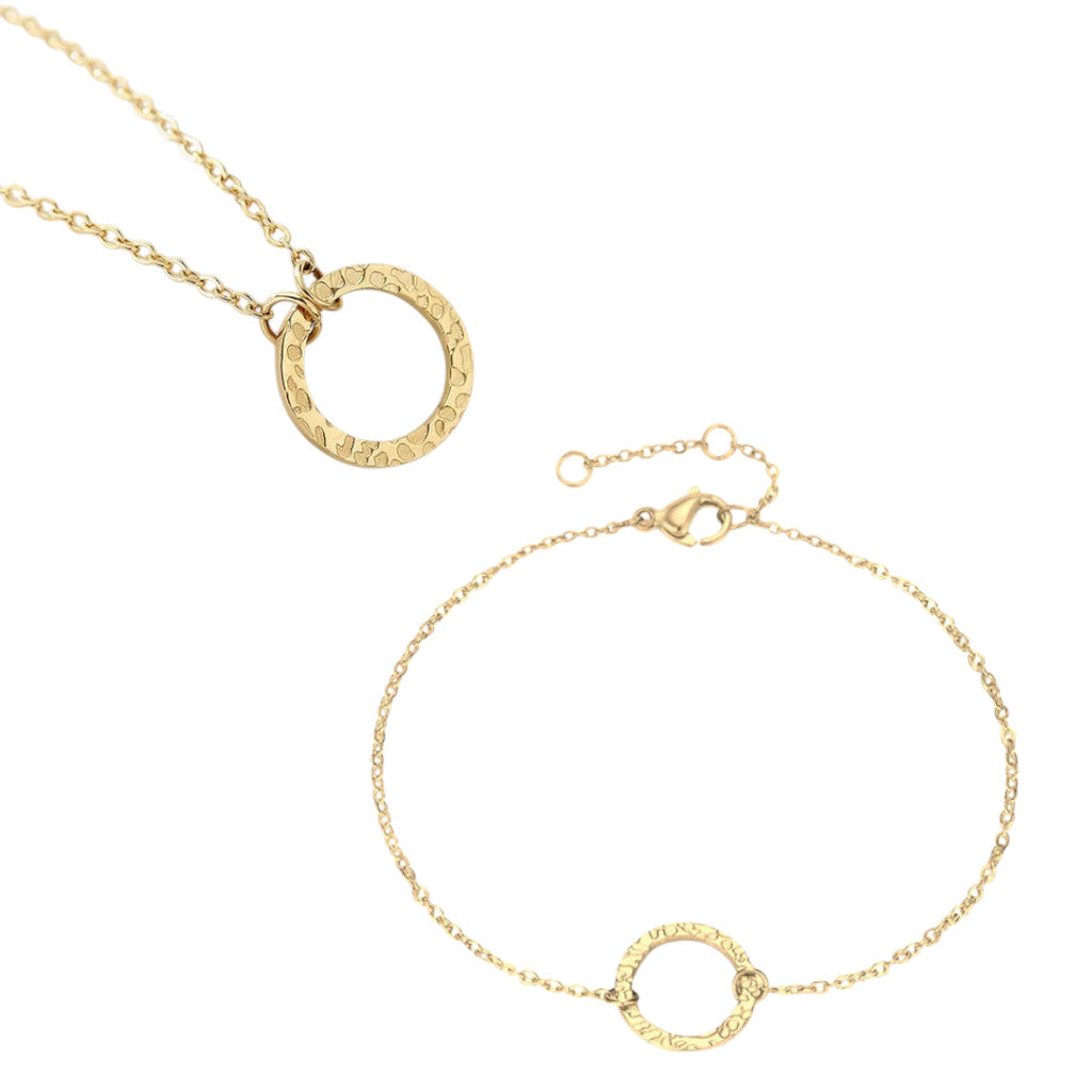 Елегантен комплект Астра, включващ колие и гривна със семпъл кръгъл елемент – символ на безкрайност, цялост и хармония. Леките и деликатни дизайни ги правят подходящи за всеки повод – от ежедневието до специалните моменти. Перфектен избор за подарък, който носи стил и смисъл.