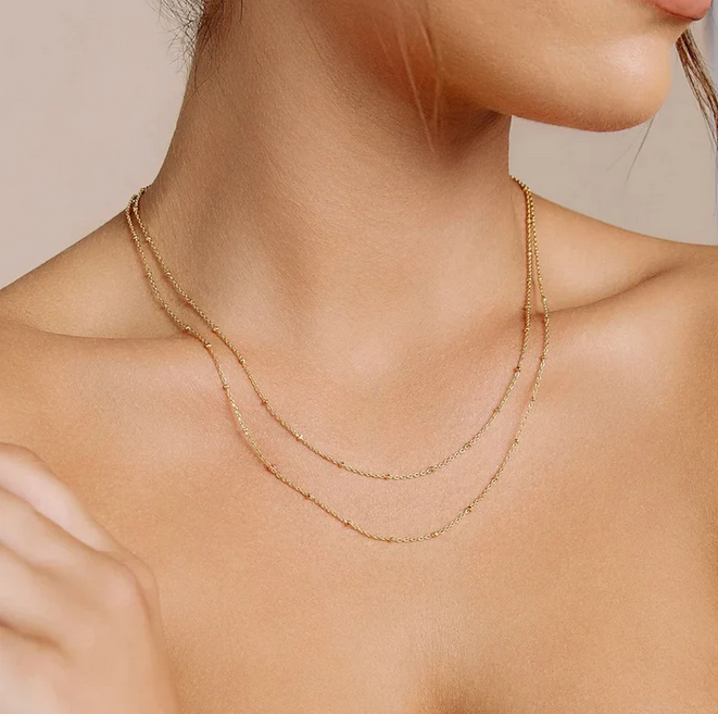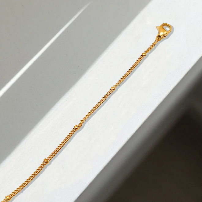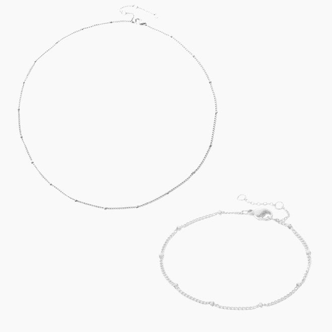 Фин и елегантен комплект, включващ колие и гривна тип bead chain, които впечатляват с деликатен блясък и изчистен стил. Със симетрично разположени мъниста по цялата дължина, този сет е чудесен избор както за ежедневно носене, така и за многослойни комбинации. Минималистичният дизайн носи усещане за класа и изисканост.