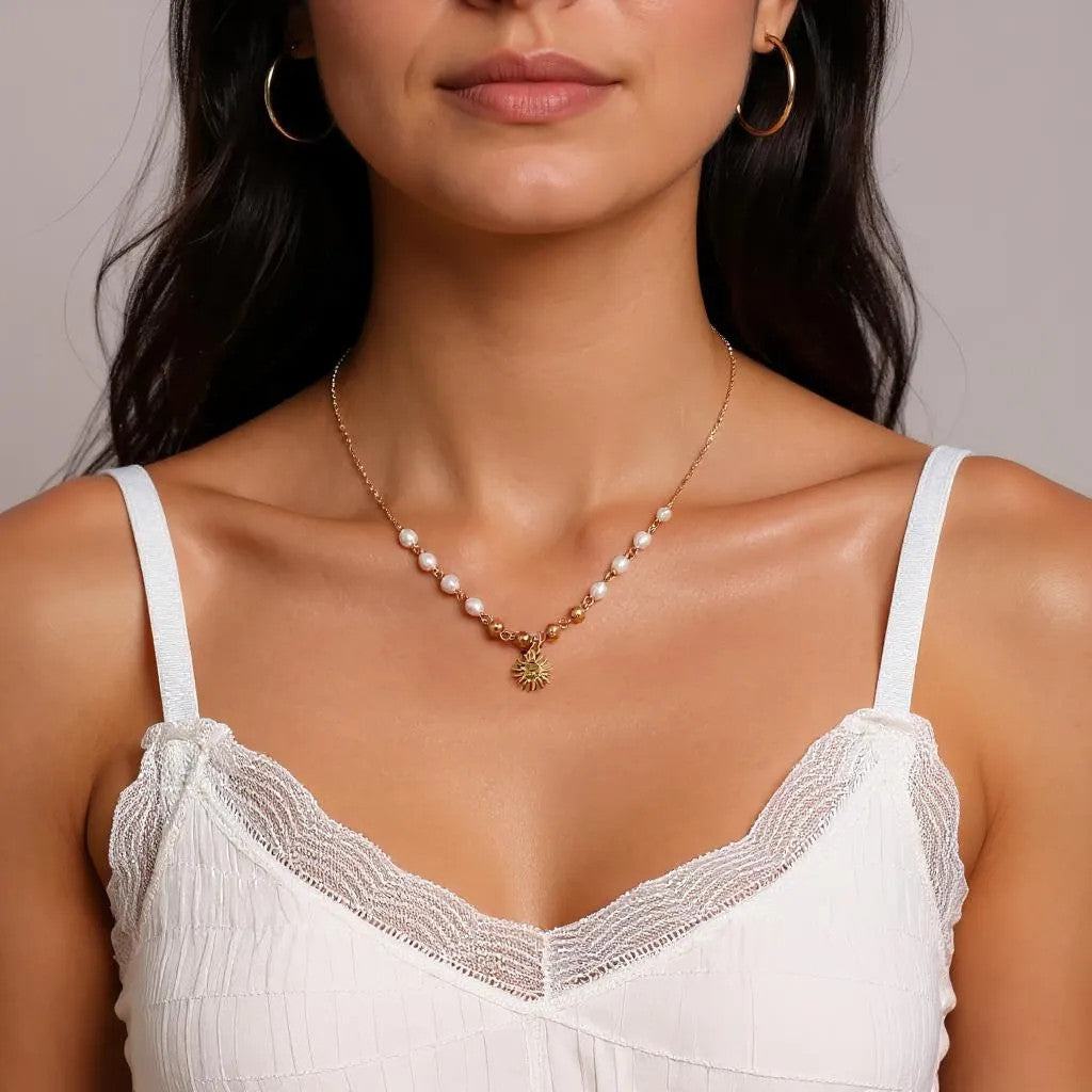 Вдъхновен от енергията и светлината на слънцето, комплектът Хелиос съчетава изискано колие с естествени перли и стилни обеци. Колието комбинира класическа верижка, нежна bead chain част и елегантен медальон – символ на топлина и позитивна енергия. Обеците са завършващият акцент – изчистени, но запомнящи се, с блясък, който озарява всяка визия. Идеален сет за жени, които обичат да носят светлината със себе си навсякъде.