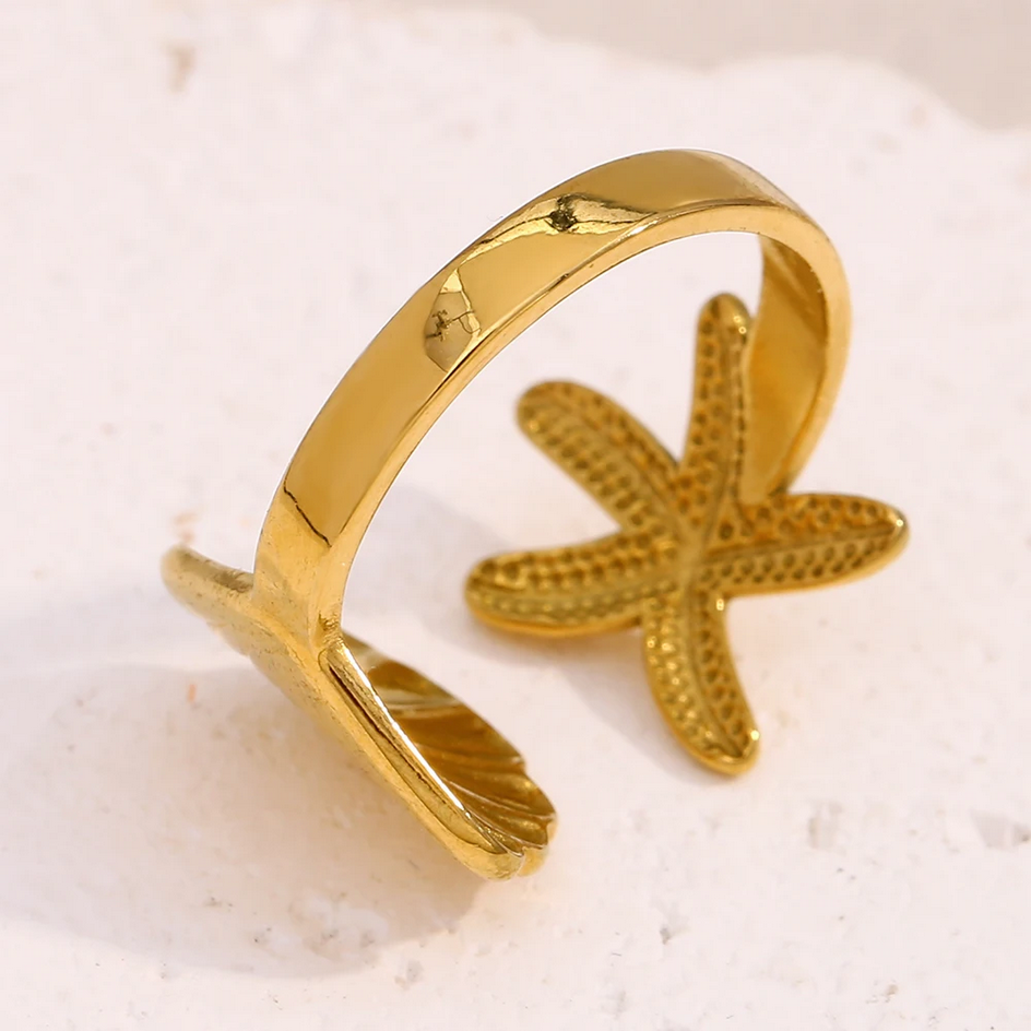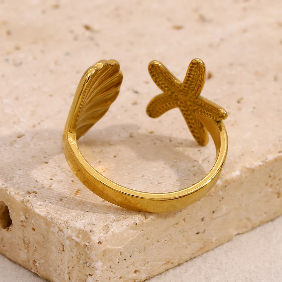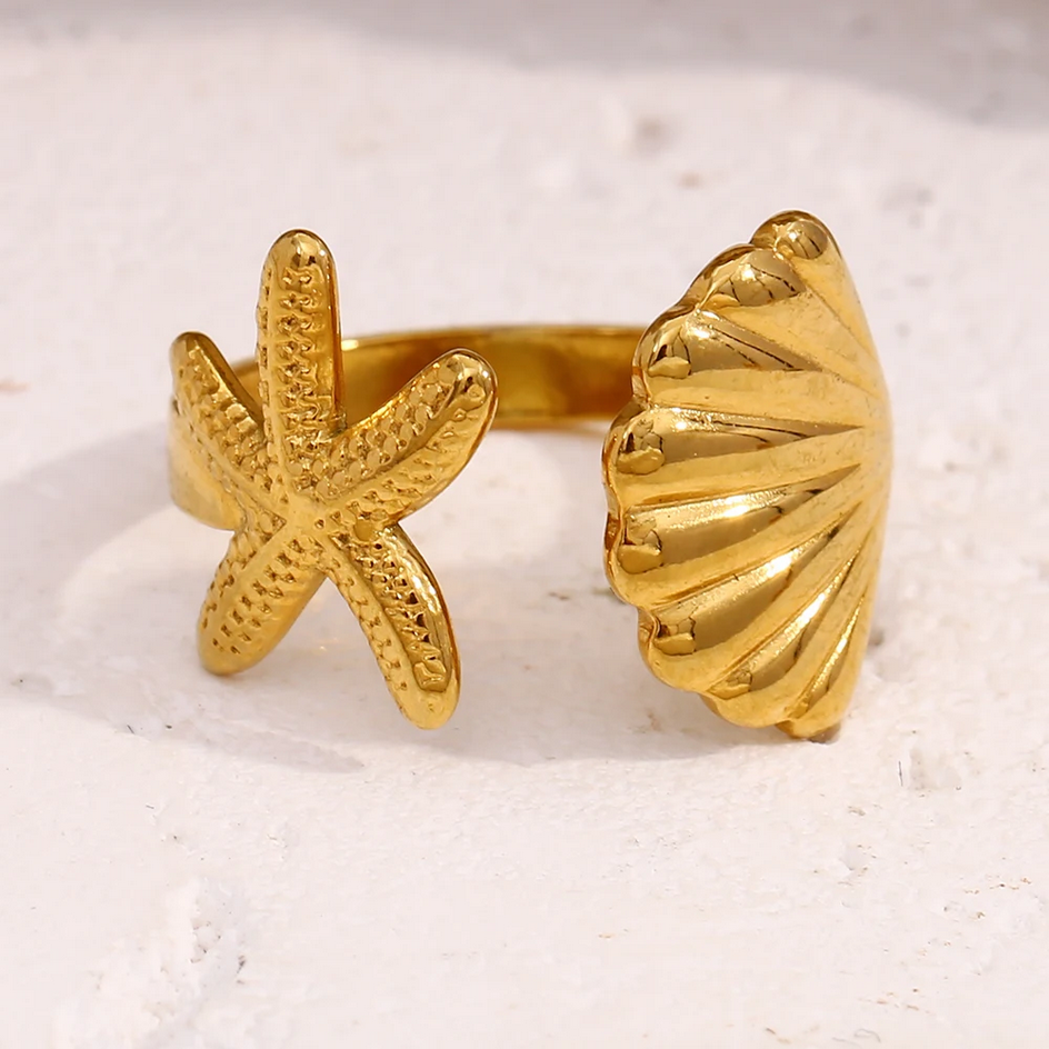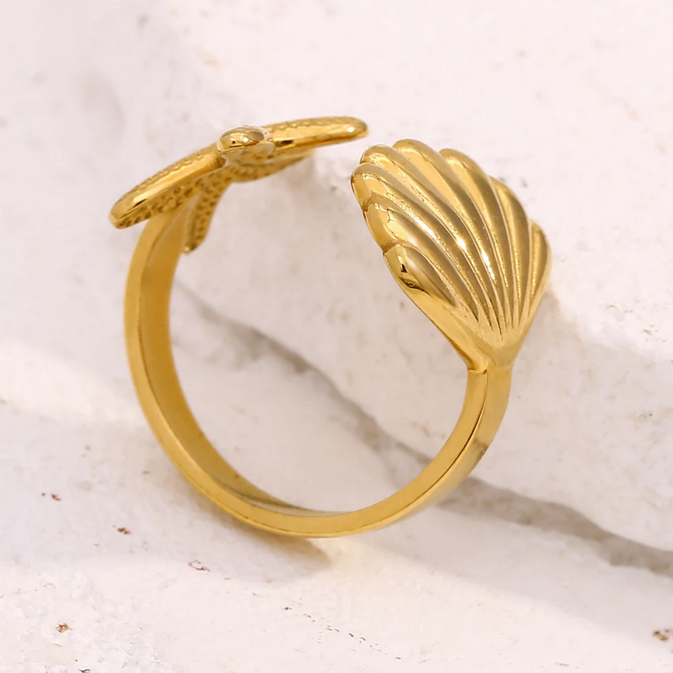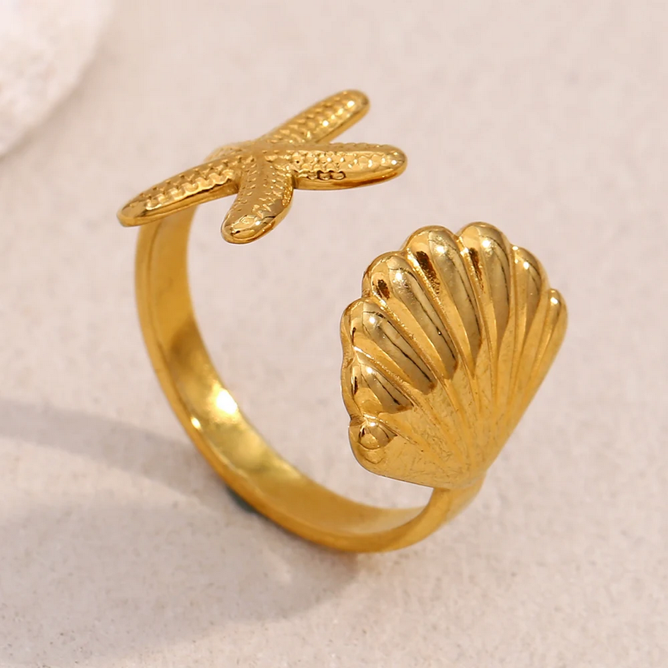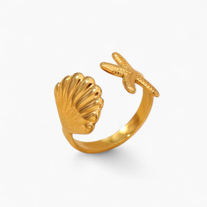 Изразителен и вдъхновен от морето пръстен с мидичка и морска звезда. Дизайнът му напомня на лятна безгрижност и нежната красота на океанските дълбини. Регулируем и впечатляващ, този модел носи усещане за свобода и блясък.
