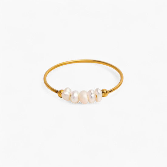 Елегантен пръстен, декориран с пет естествени сладководни перли. Съчетание от минимализъм и класа, което носи усещане за нежност и женственост. Перлите са естествени, което прави всеки пръстен уникален.