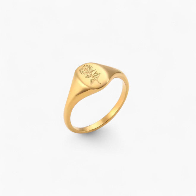 Въздействащ пръстен с гравюра на слънчоглед – символ на светлина, позитивност и сила. Изчистеният силует го прави идеален за ежедневно носене, като едновременно добавя уникален акцент към всяка визия.