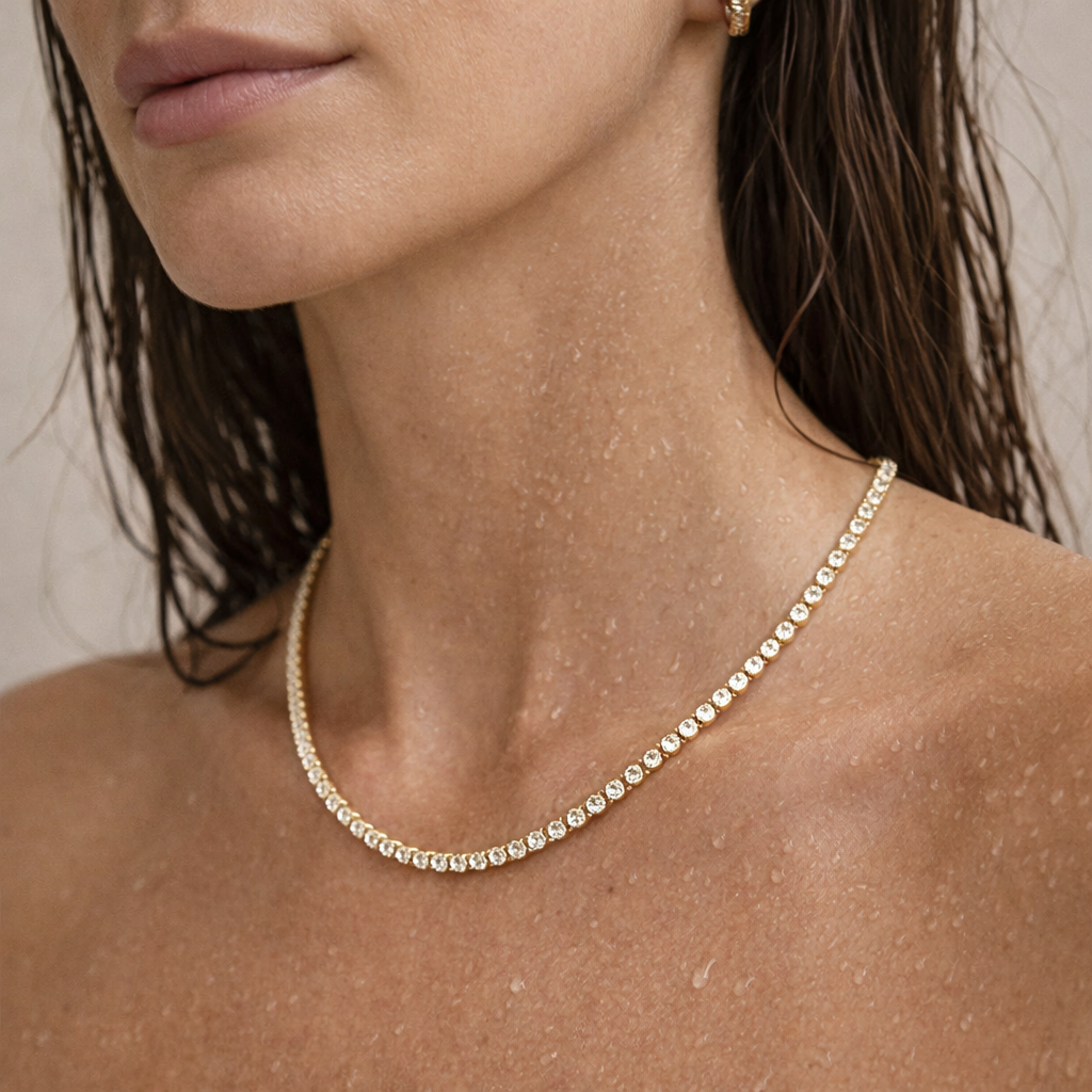 This message only appears in theme editor.Фино подредени циркони създават непрекъсната линия от блясък, която обгръща шията и китката с изчистена елегантност. Комплектът „Кармен“ съчетава класически тенис дизайн с модерно излъчване – балансиран, лек и изключително въздействащ.
